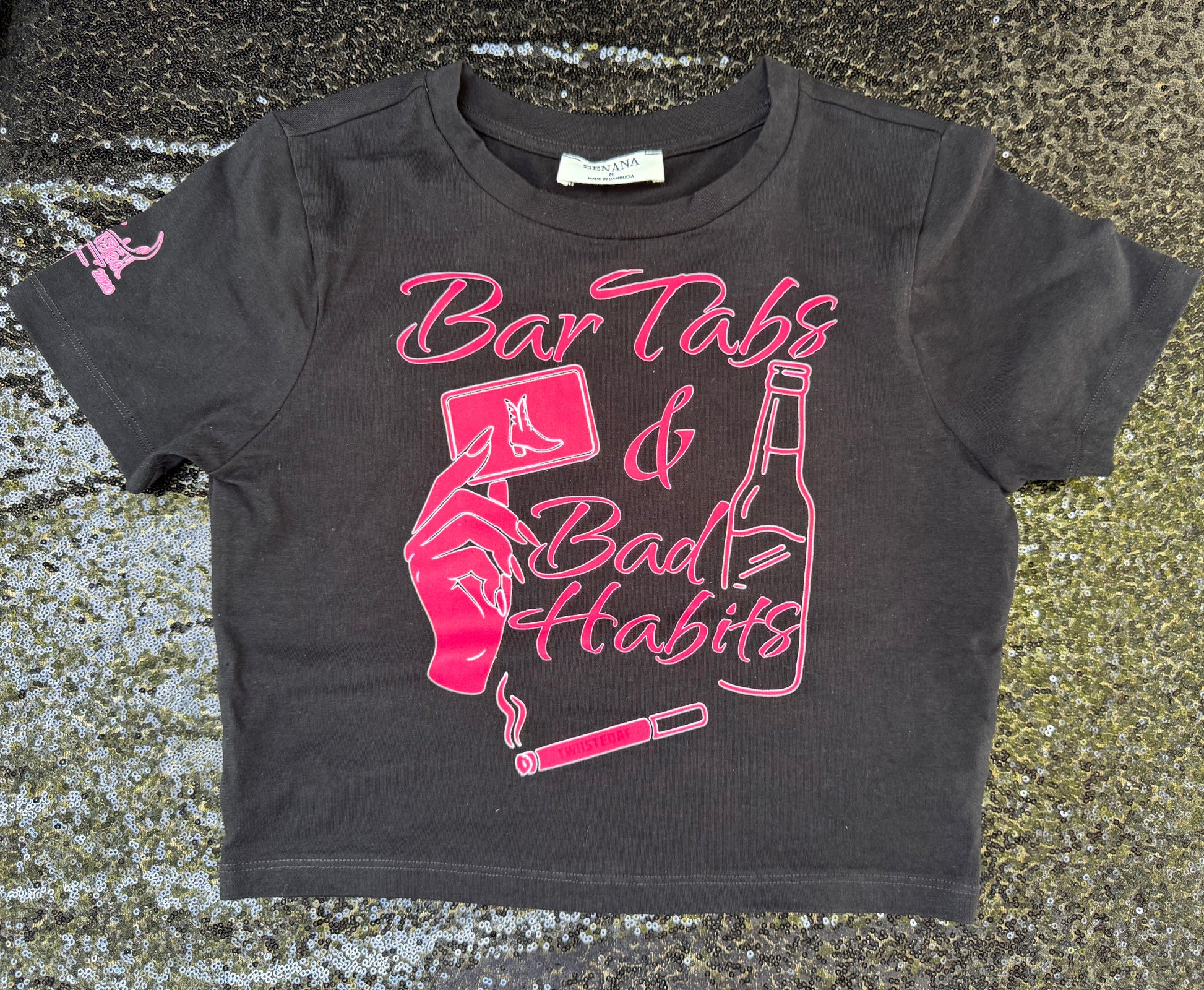 If you’ve got a wild side and a soft spot for late nights and loud jukeboxes — this tee gets you. The “Bar Tabs & Bad Habits” Crop Tee is all sass and no apologies, featuring a hot pink graphic with a bold hand-drawn design: a bottle, a smoking Twiisted cig, and a boot-stamped credit card ready to swipe. Cropped to perfection and soft as hell, this black tee is made for rebels, baddies, and every small-town heartbreaker with a story.