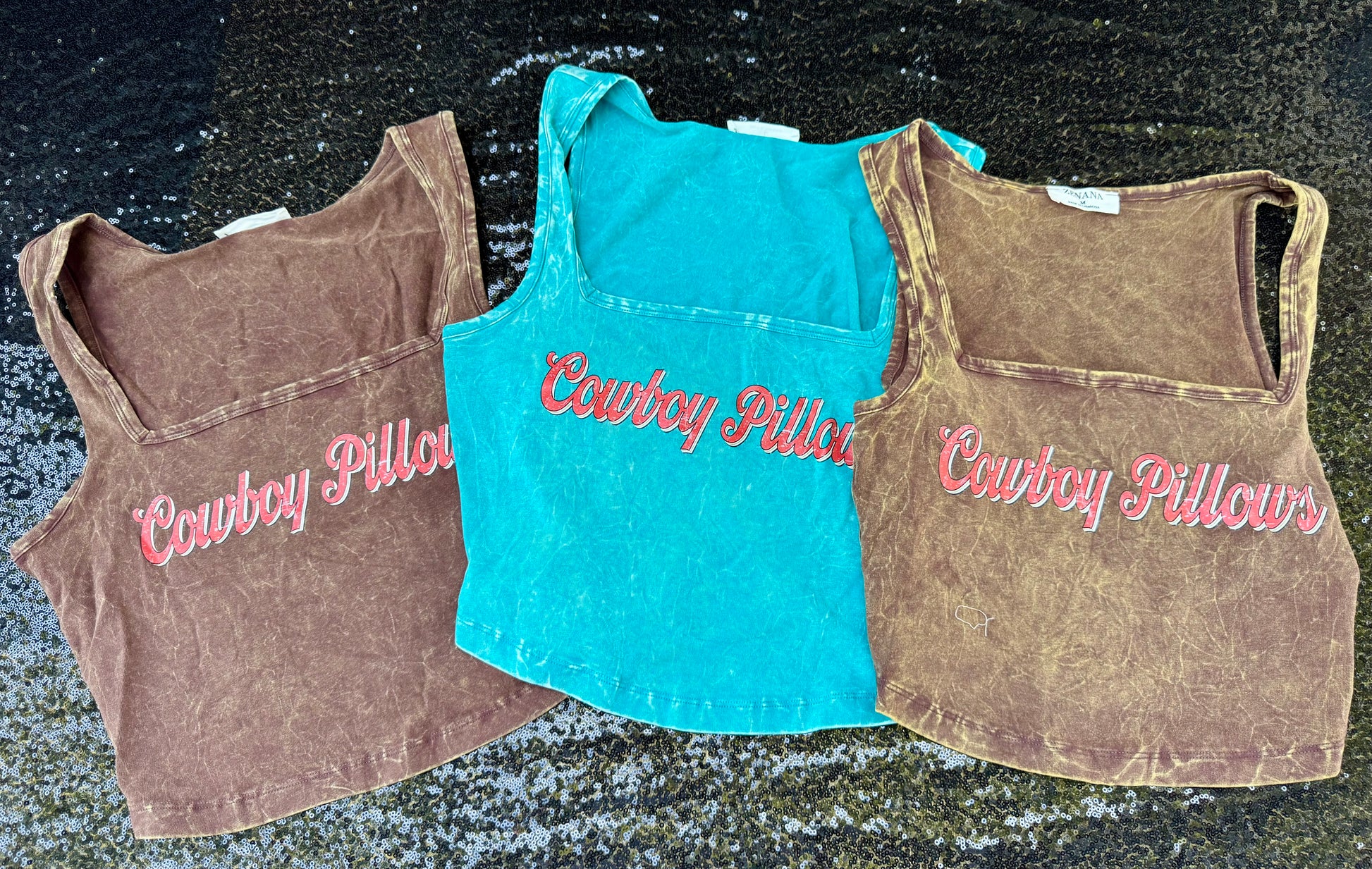 Soft, sassy, and just a little scandalous – this one’s for the cowgirls who know exactly what they like. Our “Cowboy Pillows” crop tank brings the heat with a retro red font and a flirty mineral-wash finish. With its square neckline and relaxed, raw-edged style, it’s made to turn heads at rodeos, honky-tonks, or wherever your boots take you.