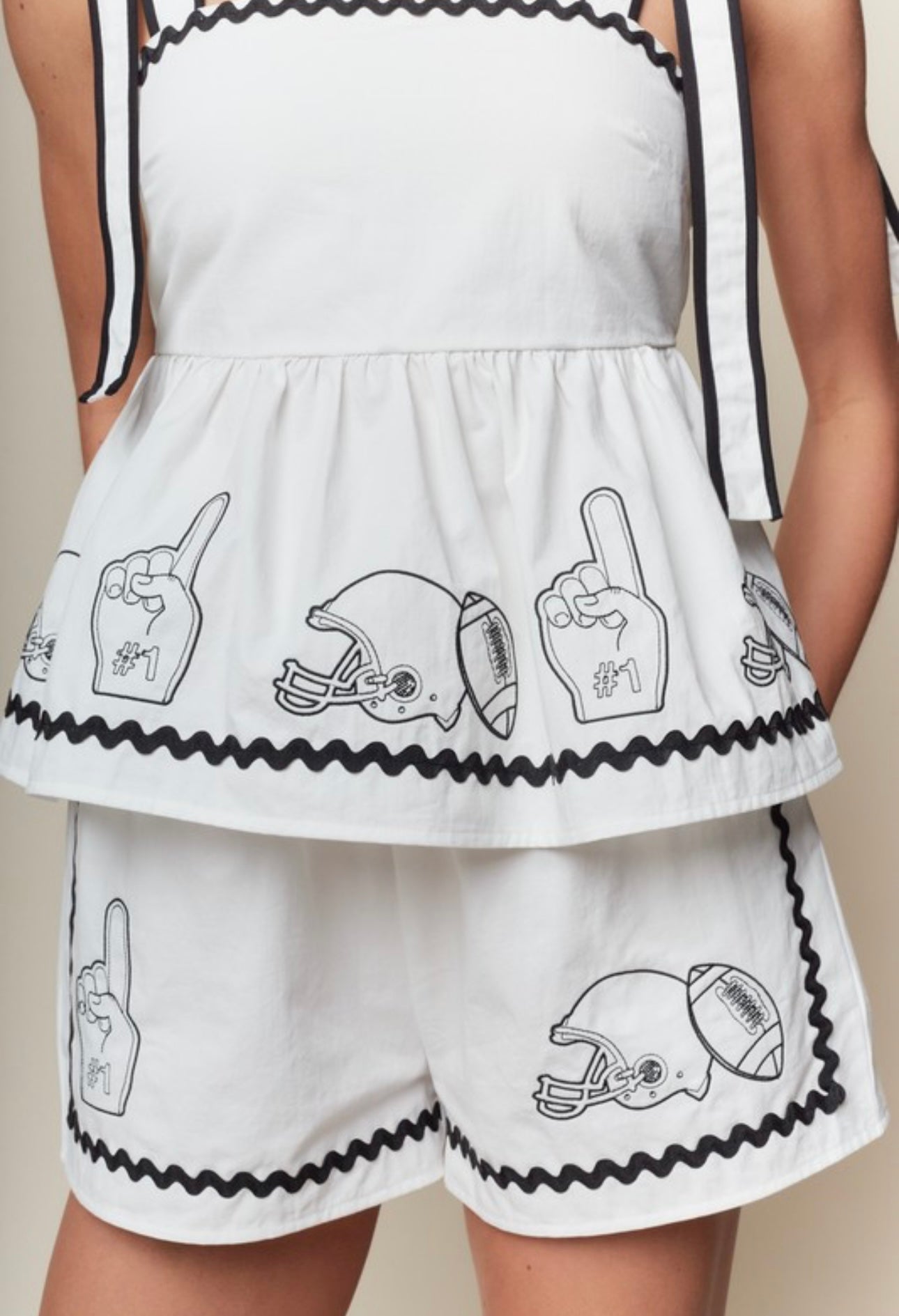 Step into Saturday in style with the Game Day Glam Set — your ultimate tailgate-to-touchdown look. Designed for college football fans who want to cheer loud and look chic, this two-piece set features a flowy peplum top with adjustable self-tie straps and matching elastic-waist shorts with side pockets. Bold ric-rac trim and embroidered game day icons (football helmets + foam fingers) add the perfect mix of sporty and glam.
