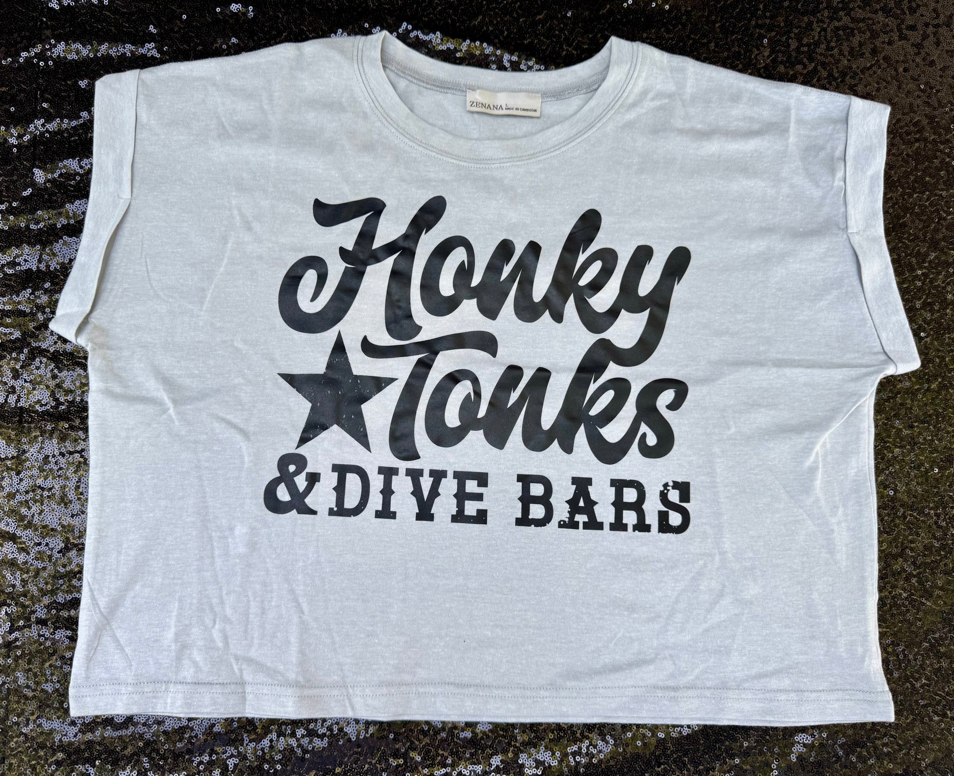 Turn up the rebel charm in our “Honky Tonks & Dive Bars” Crop Tee — the perfect blend of country sass and laid-back cool. This soft heather gray crop top features a bold black graphic that celebrates your wild side, with cuffed sleeves and a relaxed fit that keeps it comfy and flattering. Pair it with denim cutoffs or your favorite high-rise jeans and let the world know you’re all about good times and outlaw vibes.