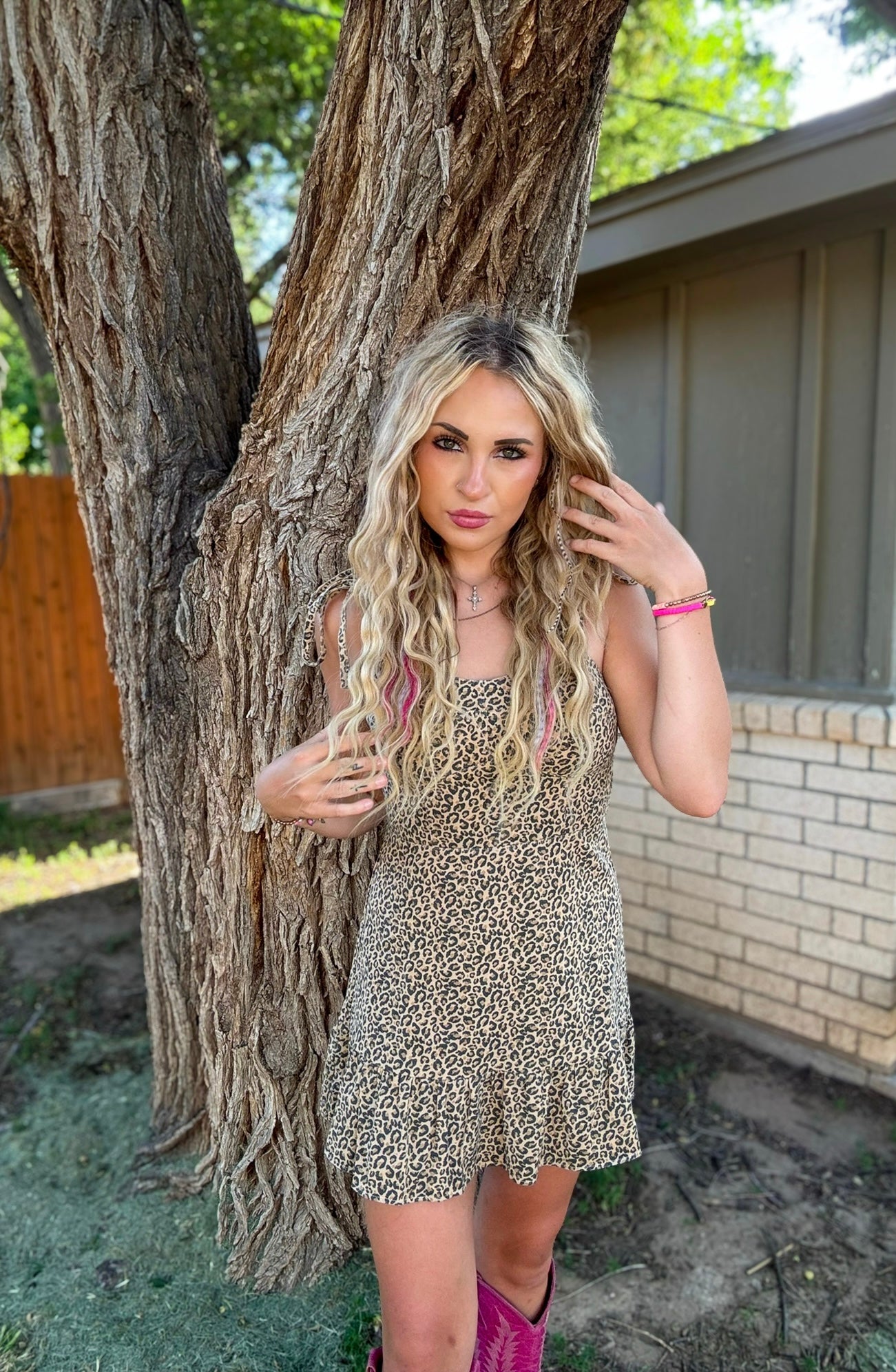 The Leopard in Denim Dress is your go-to for turning heads from the rodeo to the afterparty. With a fierce leopard print, flirty ruffle hem, and body-skimming fit, this dress brings all the sass with zero apologies. Pair it with your favorite cowgirl boots and a bad-girl attitude — because sugar and spice is overrated when you’ve got grit and glam.