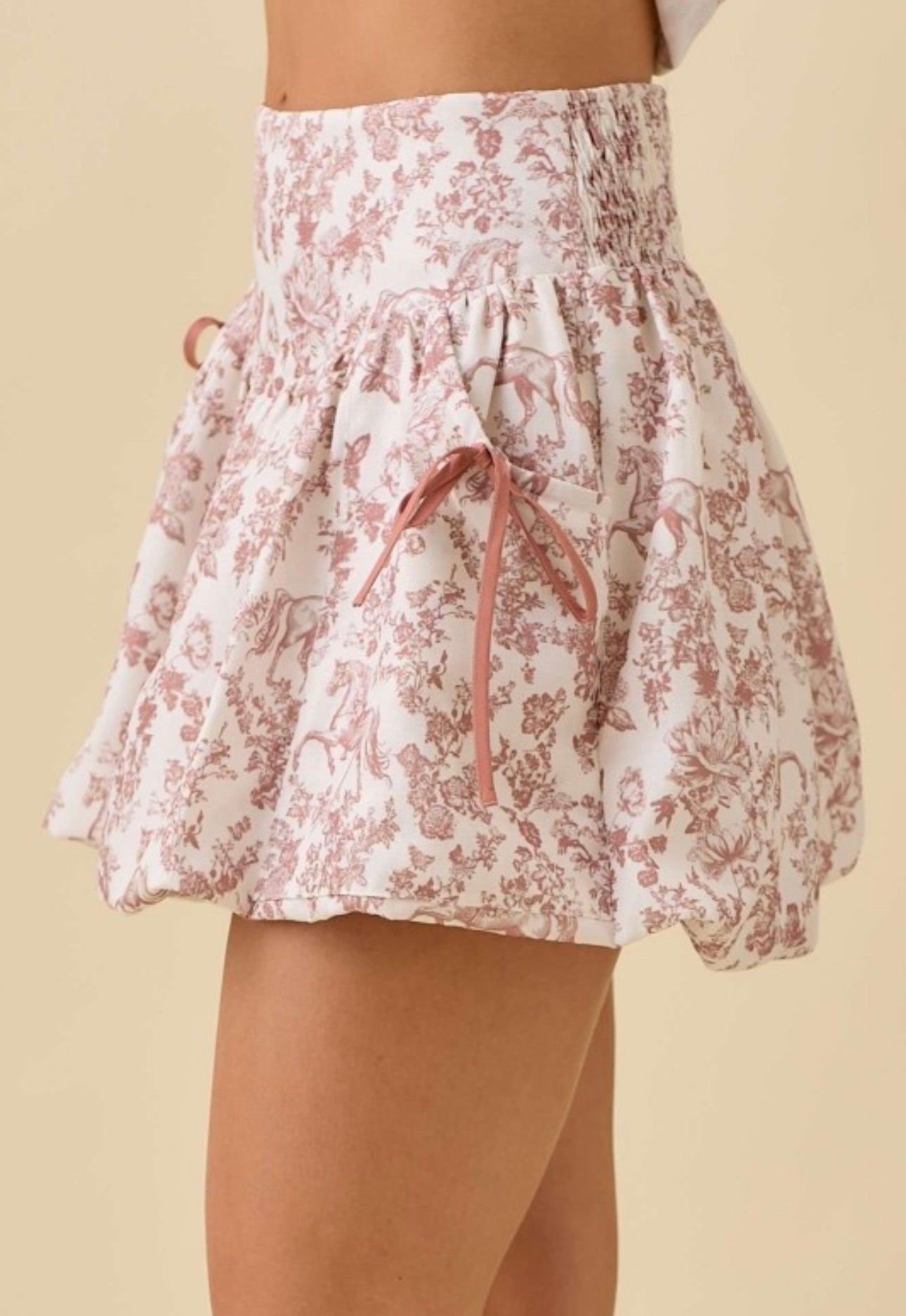 Sweet with a little sass — the Prairie Pony Toile Skirt gives cottagecore meets cowgirl energy. With its high-waisted fit, flouncy silhouette, and soft pink horse-and-floral toile print, this mini skirt is finished with dainty bow ties on each hip for the cutest extra touch. Pair it with a cropped tee, boots, or a frilly blouse for the perfect girly-meets-western vibe.