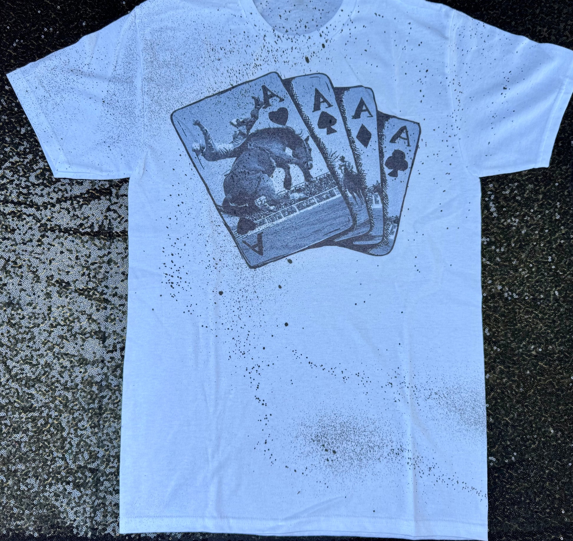 The subtle bleach splatter adds a gritty, worn-in vibe that makes each tee unique — just like the cowboy (or cowgirl) wearing it.