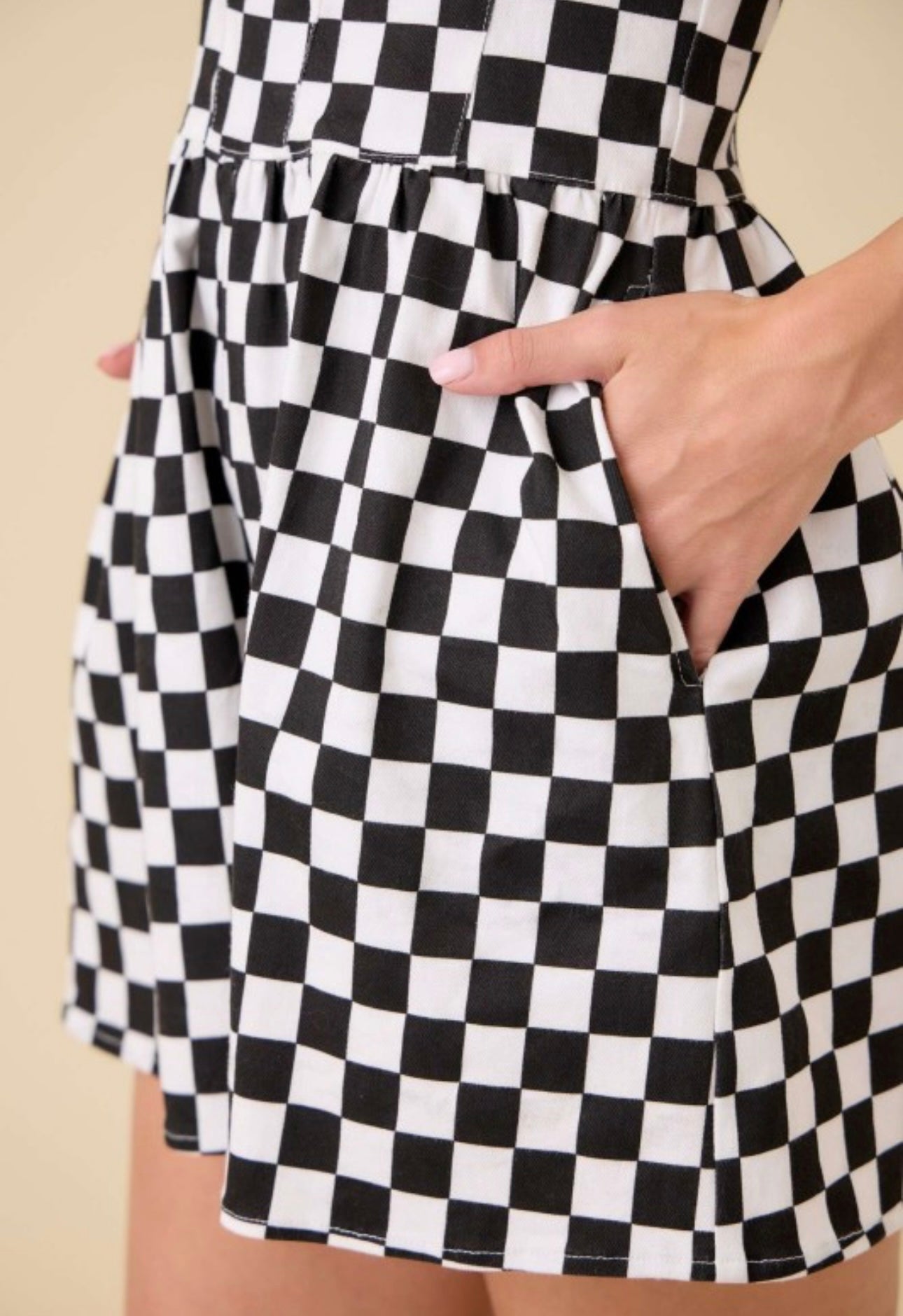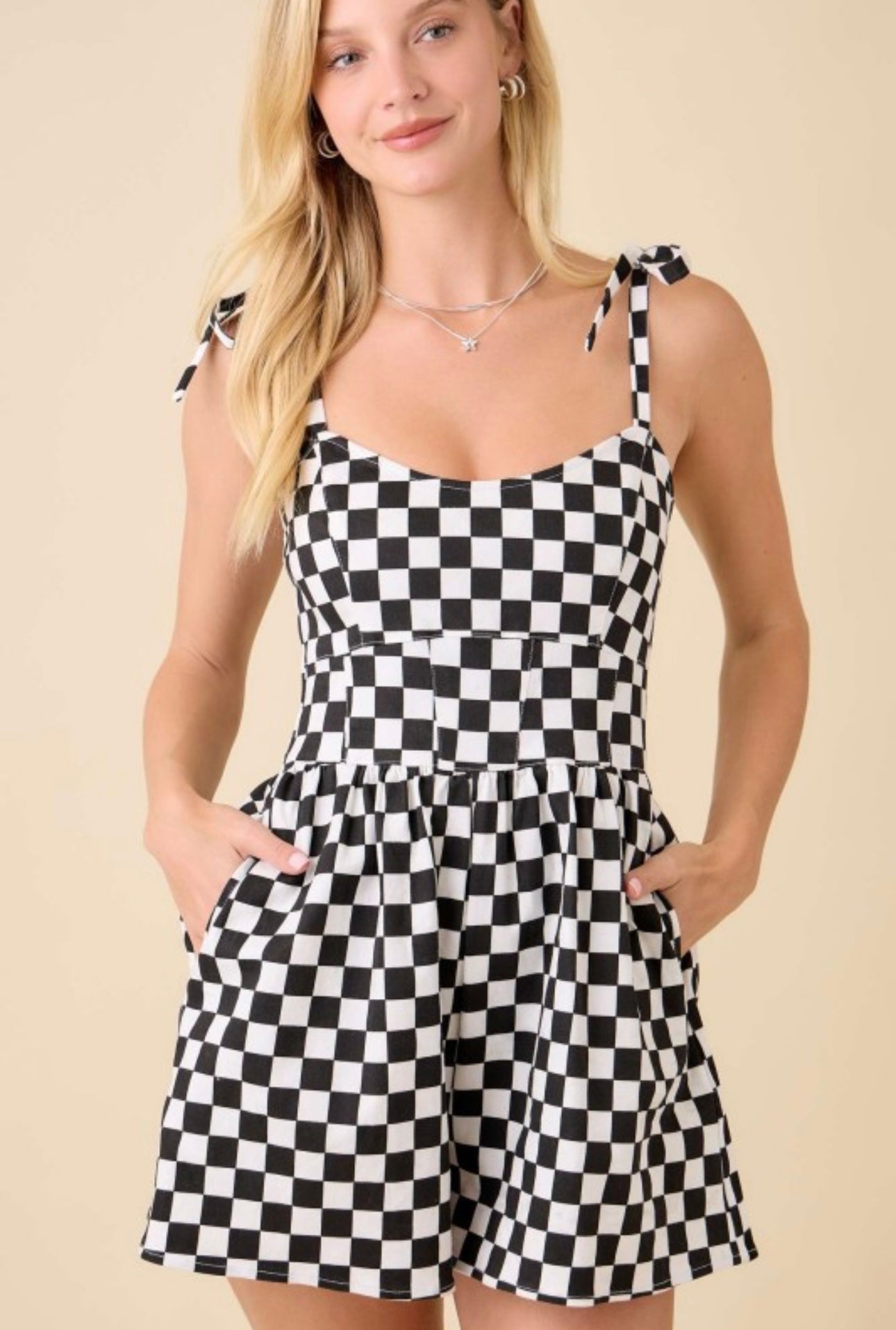 Turn heads and break hearts in the Wildcard Checker Romper — where edgy street style meets western glam. Featuring a bold black-and-white checker print, flirty tie-up shoulder straps, and a flattering fit with pockets (because duh), this romper is made for girls who don’t follow the rules — they make them.