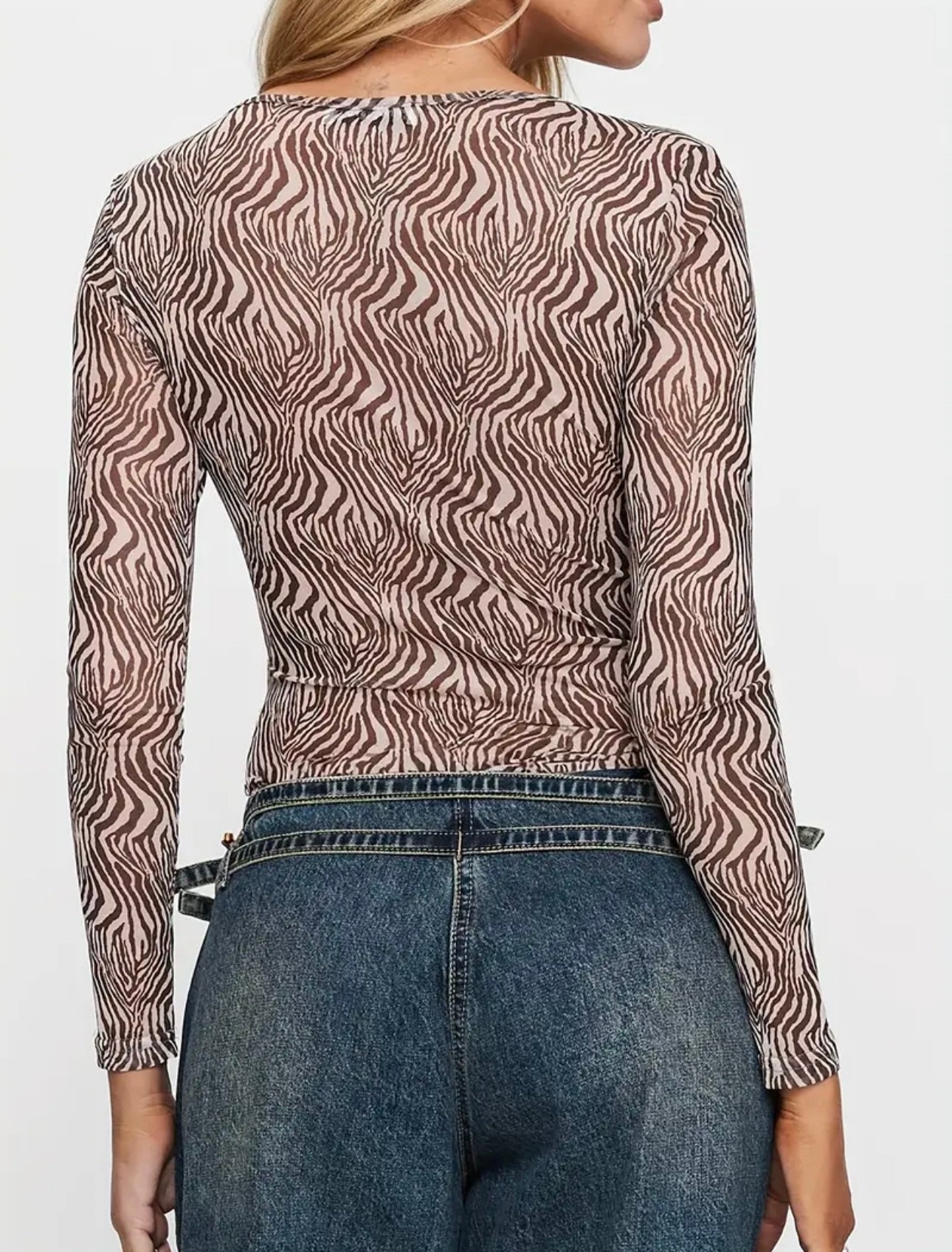 Turn heads with this wild-yet-polished zebra print mesh top. Designed in a neutral taupe and chocolate color palette, it’s the perfect blend of fierce and versatile. The sheer, lightweight mesh hugs your shape for a flattering fit, while the bold animal print keeps your look unapologetically confident. Dress it down with vintage denim or style it up with leather and heels for an instant statement.